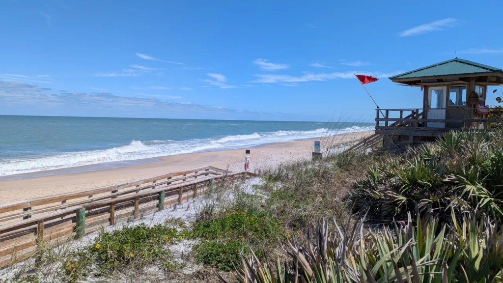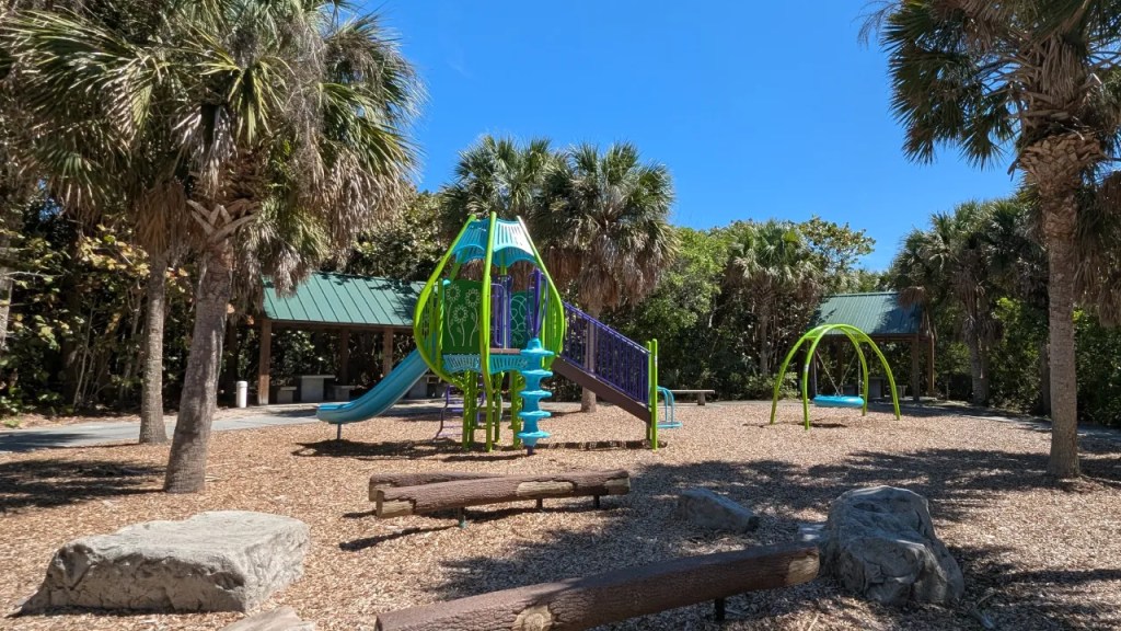 The cool thing about this beach park is it has volleyball nets and also is home to Gopher Tortoises. The walkway to the beach is very pretty and there’s lots of beach sand before you get to the ocean waves. Sadly, the restrooms were gross the day we visited. There is plenty of parking and a lifeguard but no playground. It’s also not particularly wheelchair accessible.