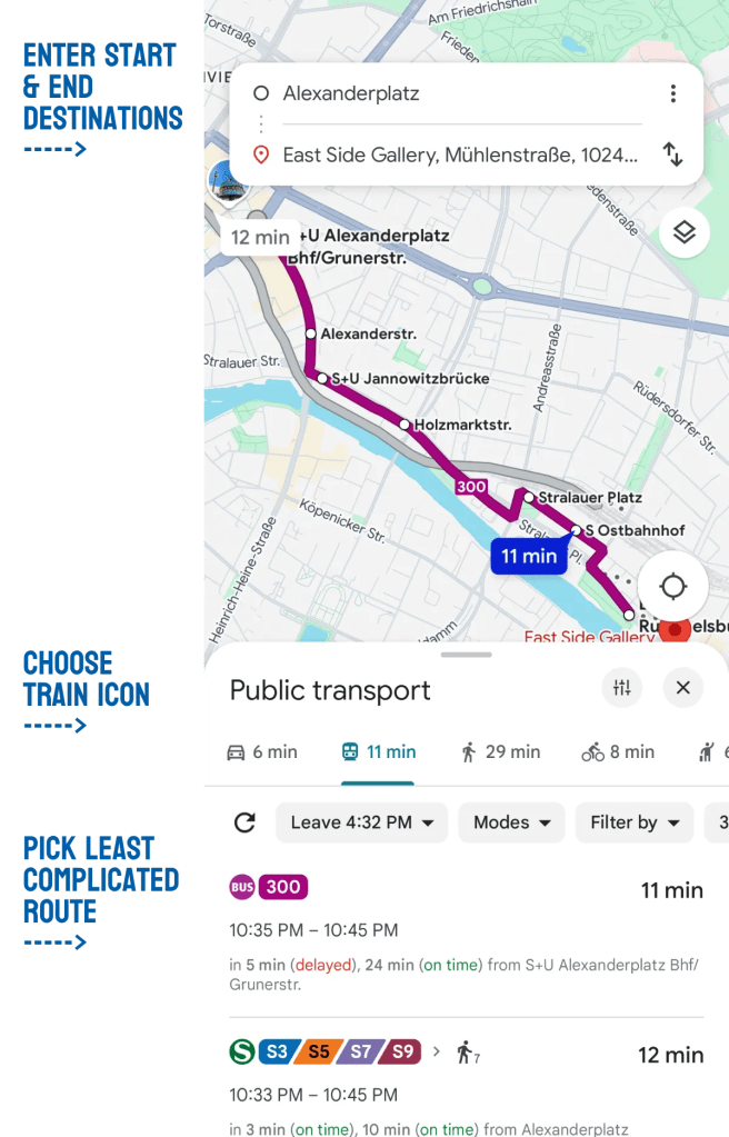 Google Maps (or Apple Maps) is a lifesaver when it comes to figuring out how to get around. Just tap the train icon instead of the car or walking icon, and you’ll see your transit options using U-Bahn, S-Bahn, or trams. I usually chose the route with the fewest transfers—as long as the wait wasn’t too long.